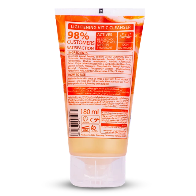 ژل شستشو روشنکننده حاوی ویتامین سی تراست به خاطر داشتن مواد مؤثره ویتامین سی، رزورسینول، سالیسیلیک اسید، آربوتین و سیم برایت، پوست را روشن و شاداب ساخته و از آن محافظت میکند. همچنین این محصول یک پاککننده ملایم و عمیق منافذ پوستی بوده و پوست را از آلودگیهای سطحی پاکسازی کرده و میزان pH پوست را تنظیم میکند.
