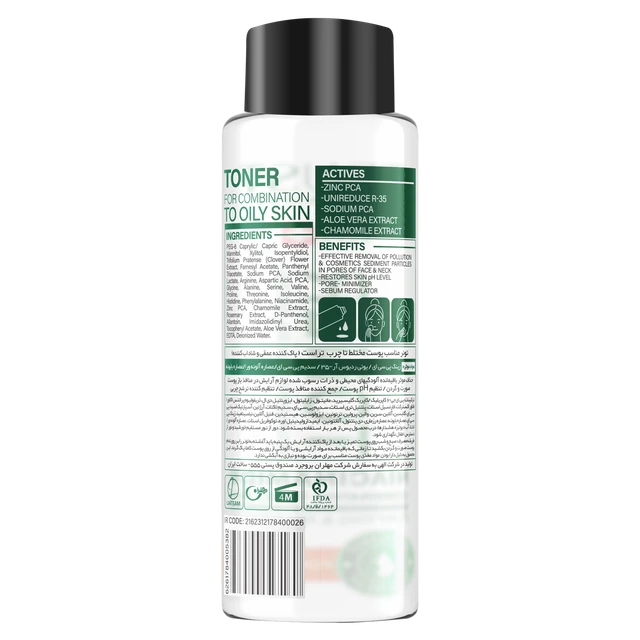 تونر مناسب پوست چرب و مختلط تراست، با داشتن زینک پی سی ای و یونی ردیوس آر-35 در ساختار خود، از ایجاد جوش و آکنه جلوگیری کرده و تولید سبوم در پوست را کنترل میکند. سدیم پی سی ای در این محصول، پوست را آبرسانی کرده و به جذب آب در لایههای سطحی پوست کمک میکند. این تونر به علت وجود عصاره آلوئهورا، از التهابات پوست جلوگیری کرده و چربی پوست را کنترل میکند. علاوه بر این، وجود عصاره بابونه در این محصول باعث ایجاد خواص آنتیاکسیدانی شده و از پوست در برابر آسیب رادیکالهای آزاد مراقبت میکند.