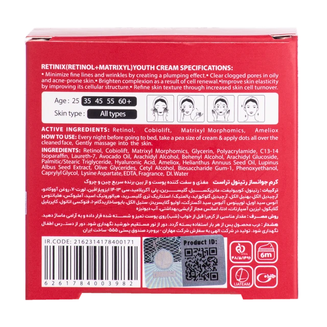 و در نهایت، آملیوکس موجود در کرم جوانساز رتینول تراست، با جلوگیری از تأثیر پرتوهای مضر UV و با خواص آنتیاکسیدانی ویژهای که دارد، چینوچروکهای پوستی را بهبود بخشیده و از شکستن و تغییر فرو پروتئین کلاژن و نیز پیری پوست جلوگیری میکند. در کنار مواد مؤثره مطرحشده، این محصول تراست، با عصاره دانه لوپینوس آلبوس، به حفظ استحکام و افزایش خاصیت کشسانی پوست، با لایزین آسپارتات، به بهبود سوختوساز سلولهای پوستی و تکثیر آنها، با روغن آووکادو، به حفظ استحکام و پایداری پوست و با هلیانتوس آنوس سید اویل، به بهبود آبرسانی و جلوگیری از پیری پوست، کمک میکند.