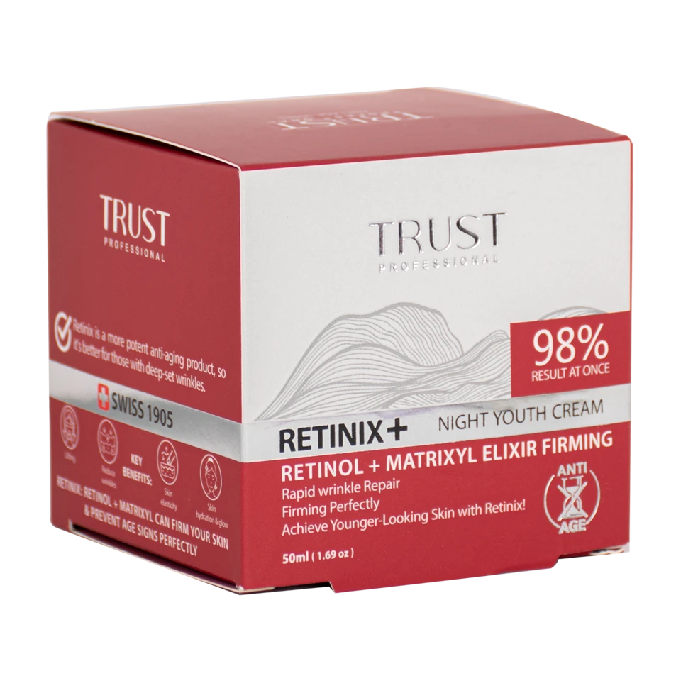 از آنجاییکه با افزایش سن و گذشت زمان، به صورت طبیعی، میزان تولید پروتئینهای استحکامبخش پوست کاهش یافته و پوست دچار چینوچروک میگردد، پوست به مراقبت و آبرسانی بیشتری نیاز دارد؛ بنابراین استفاده از محصولات تخصصی ضدچروک برای همه افراد ضرورت دارد. کرم جوانساز رتینول تراست، به واسطه بهرهمندی از ماده مؤثره رتینول و با افزایش تکثیر سلولهای پوستی و افزایش تولید کلاژن در آنها، به بازسازی سلولهای مرده پوستی و افزایش استحکام پوست کمک میکند و با داشتن خواص آنتیاکسیدانی و مهار رادیکالهای آزاد، جلوی ایجاد چینوچروک در پوست را میگیرد. همچنین با داشتن ترکیب فعال ماتریکسیل مورفومیکس، به طرز مؤثری چینوچروکهای صورت، به ویژه خطوط عمودی آن و چروکهای پنجه کلاغی را از بین برده و به تقویت ساختار پوست صورت کمک میکند.