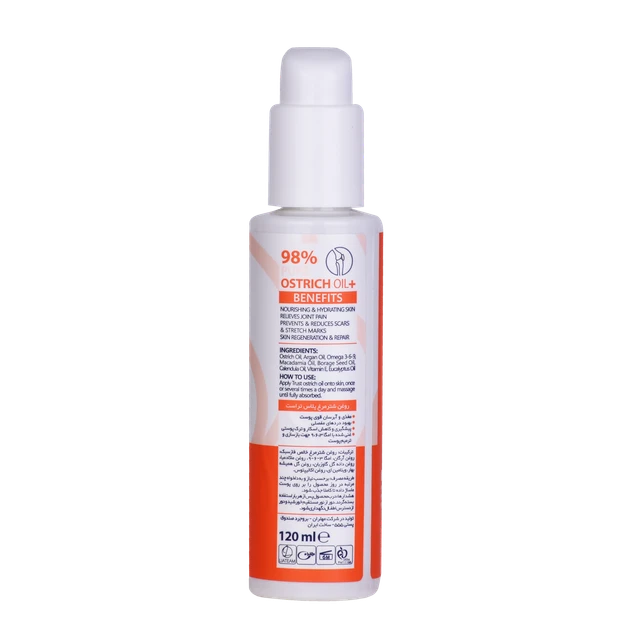 روغن شترمرغ غنی شده تراست برای اولین بار با بهره گیری از فاز سبک روغن شترمرغ بصورت کاملا خالص (خلوص 98 درصدی) در کنار یک کمپلکس ویتامین در کنار روغن کالاندولا و روغن جوجوبا همراه با کره گیاهی (شی باتر) سبب حفاظت از پوست در برابر شرایط سخت محیطی میگردد. روغن شترمرغ غنی از امگا 3 و امگا 6 بوده که در کنار روغن جوجوبا با توانایی نفوذ به لایههای زیرین پوست، علاوه بر بازسازی و بهبود عملکرد پوست موجب آبرسانی طولانیمدت پوست میگردد.